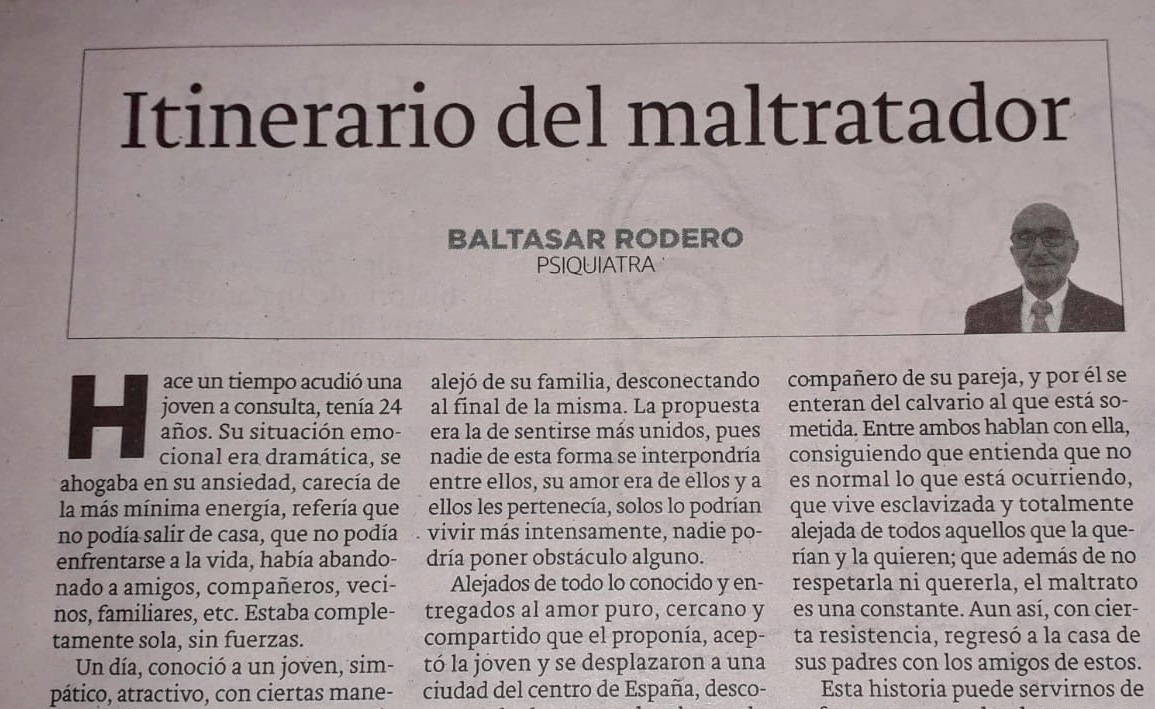 Itinerario del maltratador. Hace un tiempo, acudió una joven a consulta, tenía 24 años. Su situación emocional era dramática, se ahogaba en su ansiedad, carecía de la más mínima energía, refería que no podía salir de casa, que no podía enfrentarse a la vida, había abandonado a: amigos, compañeros, vecinos, familiares, etc., estaba completamente sola, […]